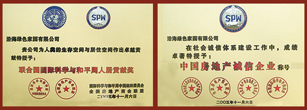 與沿海綠色家園一同獲得“中國房地產誠信企業”稱號的有萬科、中海、北京華遠、北京萬通、SOHO中國、大華集團、今典集團等知名房地產企業。