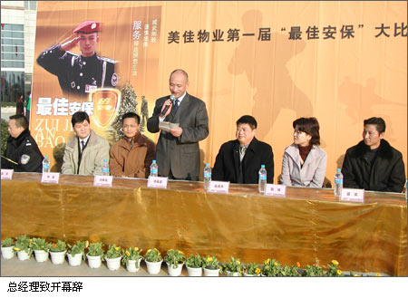 12月23日上午八點半,武漢麗水佳園陽光廣場鑼鼓喧天、紅綢飛舞,麗水佳園的腰鼓隊也前來為大比武助興。滿目燦爛的陽光,到處是攢動的人群,4個大氣球懸飄在空中,“熱烈歡迎美佳物業(yè)來自全國各地的安保精英”的橫幅尤為奪目。隨著800響禮花鞭炮,總公司品質(zhì)管理部高經(jīng)郭曉霞宣布大比武開幕,美佳物業(yè)總公司總經(jīng)理涂春安致開幕詞并接受了新聞單位的現(xiàn)場采訪;沿海集團華中區(qū)域公司副總經(jīng)理劉爭明、陳琳,常務(wù)董事解波、武漢商業(yè)城總經(jīng)理俞良平等領(lǐng)導(dǎo)在主席臺就坐,同時發(fā)表了熱情洋溢的賀詞;武漢市公安局東西湖區(qū)派出所、江漢區(qū)東漢正街派出所警官和萬商白馬、麗水佳園的業(yè)主代表也蒞臨祝賀并捐贈了禮品。