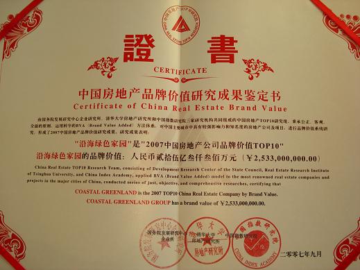 在這次“2007中國房地產公司品牌TOP10”的光榮榜上,沿海地產獲得“2007中國房地產公司品牌價值TOP10”、“2007中國房地產品牌典范企業”及“2007中國房地產專業領先品牌--健康住宅”等榮譽;沿海·賽洛城和麗水系列項目品牌雙雙躋身“2007中國房地產項目品牌價值TOP10”稱號。企業品牌和項目品牌同時獲獎,充分證明沿海集團的健康地產追求和項目品牌建設得到了共同認可。