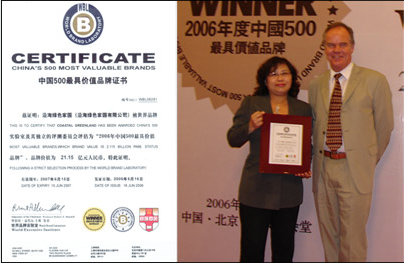 會議上,沿海集團(tuán)營銷副總裁韋桂清女士代表沿海集團(tuán)領(lǐng)取世界品牌實驗室評估機(jī)構(gòu)及其獨立評測委員會授予沿海集團(tuán)的“2006年中國500最具價值品牌”榮譽(yù)稱號及證書。沿海集團(tuán)品牌價值評估為21.15億元,在“中國500最具價值品牌”中位列第281位。