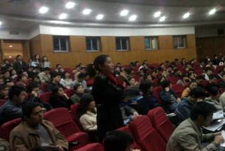 下午6時,東南大學榴園逸夫廳能容納300多人的報告廳人頭濟濟。為了滿足不斷前來聽講的同學要求,會場管理人員在會場臨時增加了五六十個座位,但仍有不少同學只能站著聽講座。