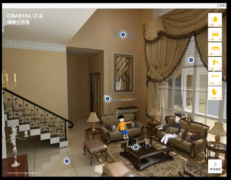 新官網改版的最大的亮點是網絡3D版“健康生活館”的正式發布?!敖】瞪铕^”以家庭生活的小環節為串聯節點,從“庭院”、“客廳”“廚房”“臥室”“洗手間”等五大生活空間,集中呈現了沿海健康住宅技術系中的20余項的主要技術運作原理及相關運營參數,訪問者可直觀地感受健康住宅技術如何讓生活更美好。