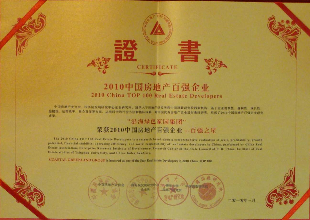 2010年3月26日,“2010中國房地產百強企業研究成果發布會暨第七屆中國房地產百強企業家峰會”在北京釣魚臺國賓館召開,現場發布了2010中國房地產百強企業研究最新成果,沿海集團獲得“2010中國房地產百強企業”稱號、“2010年中國房地產百強企業——百強之星”。這是自2005年起,沿海連續六年獲得百強企業稱號。