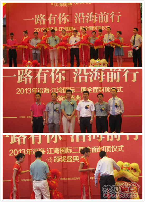 為了慶祝封頂儀式,活動現場穿插了“鑼鼓喧天”、醒獅“點睛”等重要環節,沿海地產還為先進建設單位和個人頒發了榮譽獎章。