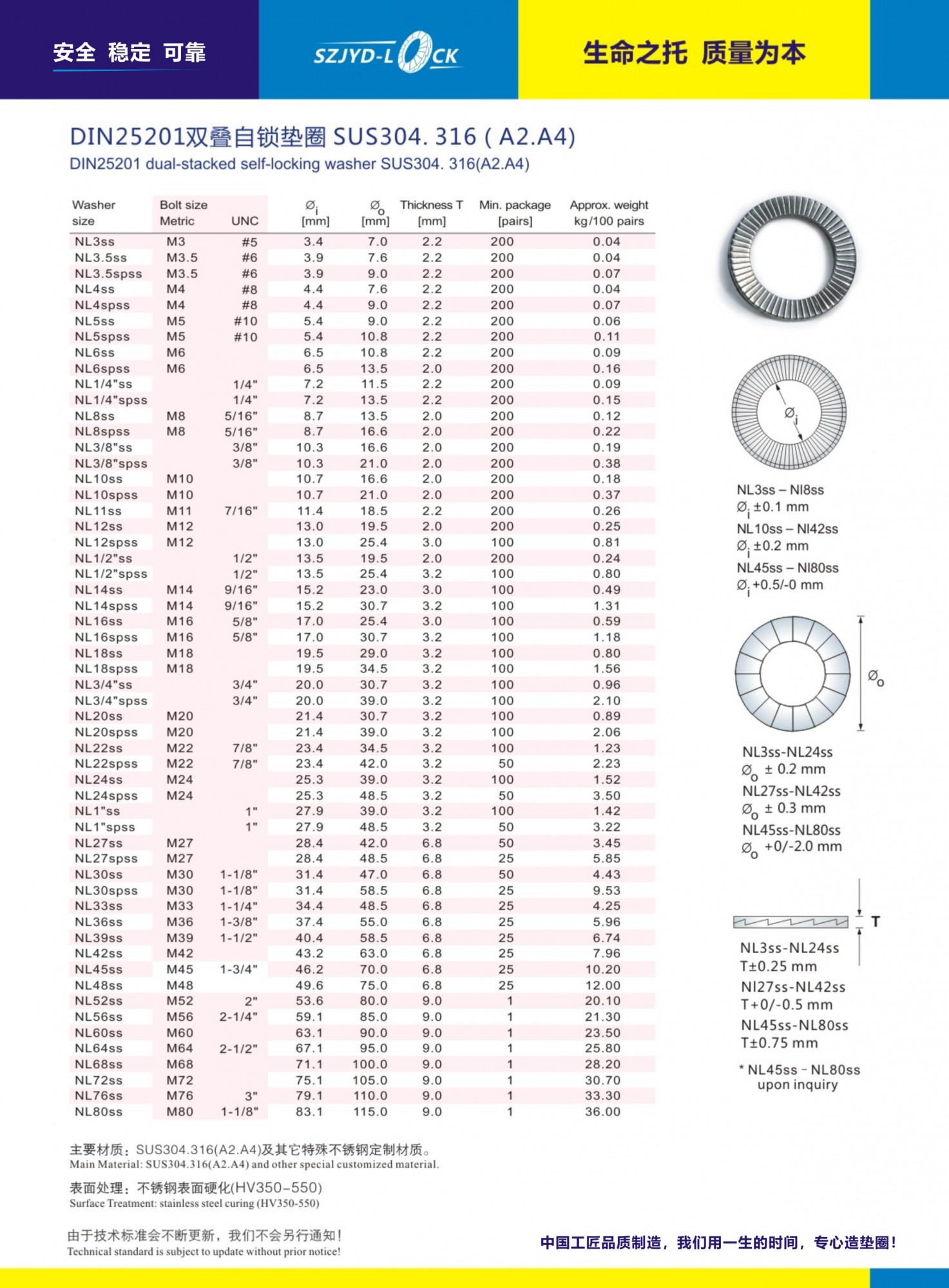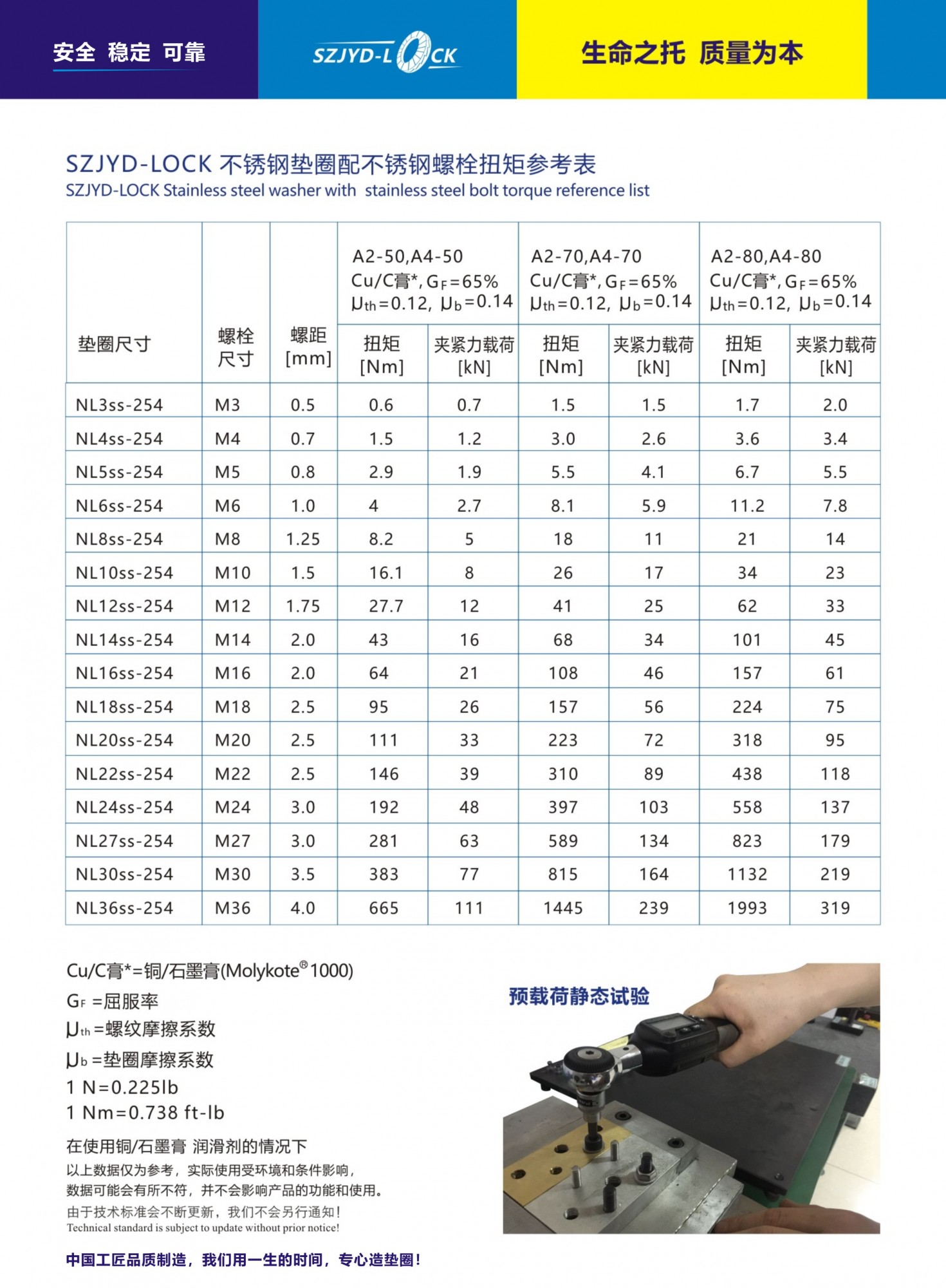 表面全部清洗拋光處理; 雙疊自鎖墊圈的使用:墊圈兩個(gè)大斜齒面成對粘合,目的是便於安裝和防止錯(cuò)誤用!墊圈的硬度必須高于螺栓的硬度!SZJYD-LOCK墊圈全部經(jīng)過DIN65151橫向振動(dòng)測試可以達(dá)到200萬測試、其衰減率不低于70%!