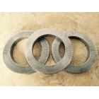 獨(dú)特的墊圈內(nèi)側(cè)斜齒面傾斜角度 α 大于螺栓螺紋傾斜角度 β 。 裝配時(shí), 內(nèi)側(cè)斜齒面是相對的, 墊圈外側(cè)放射狀的凸紋面 (外滾花齒面) 的摩擦系數(shù)要比內(nèi)側(cè)斜齒面 的摩擦系數(shù)大, 且與兩端接觸面成咬合狀態(tài)。 當(dāng)連接件受到振動(dòng), 并使螺栓發(fā)生松動(dòng)趨勢時(shí), 僅僅允許兩片墊圈內(nèi)側(cè)斜齒間相對抬升錯(cuò)動(dòng), 產(chǎn)生擡升張力。 獨(dú)特的齒牙系統(tǒng)利用張力在緊固的 連接處產(chǎn)生壹個(gè)很高的抵抗力來經(jīng)受振動(dòng)力,從而達(dá)到 100% 的防松效果。
