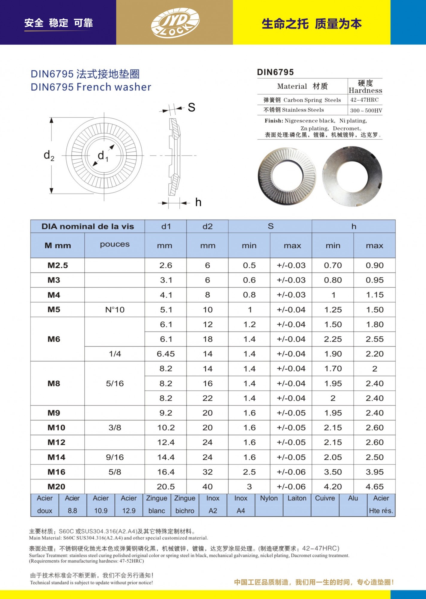 碟形墊圈改良型號,齒紋與帶抓設(shè)計,具有防松與剌破功能,符合NFE25511設(shè)計,執(zhí)行DIN6795德國標(biāo)準(zhǔn)生產(chǎn),長期現(xiàn)