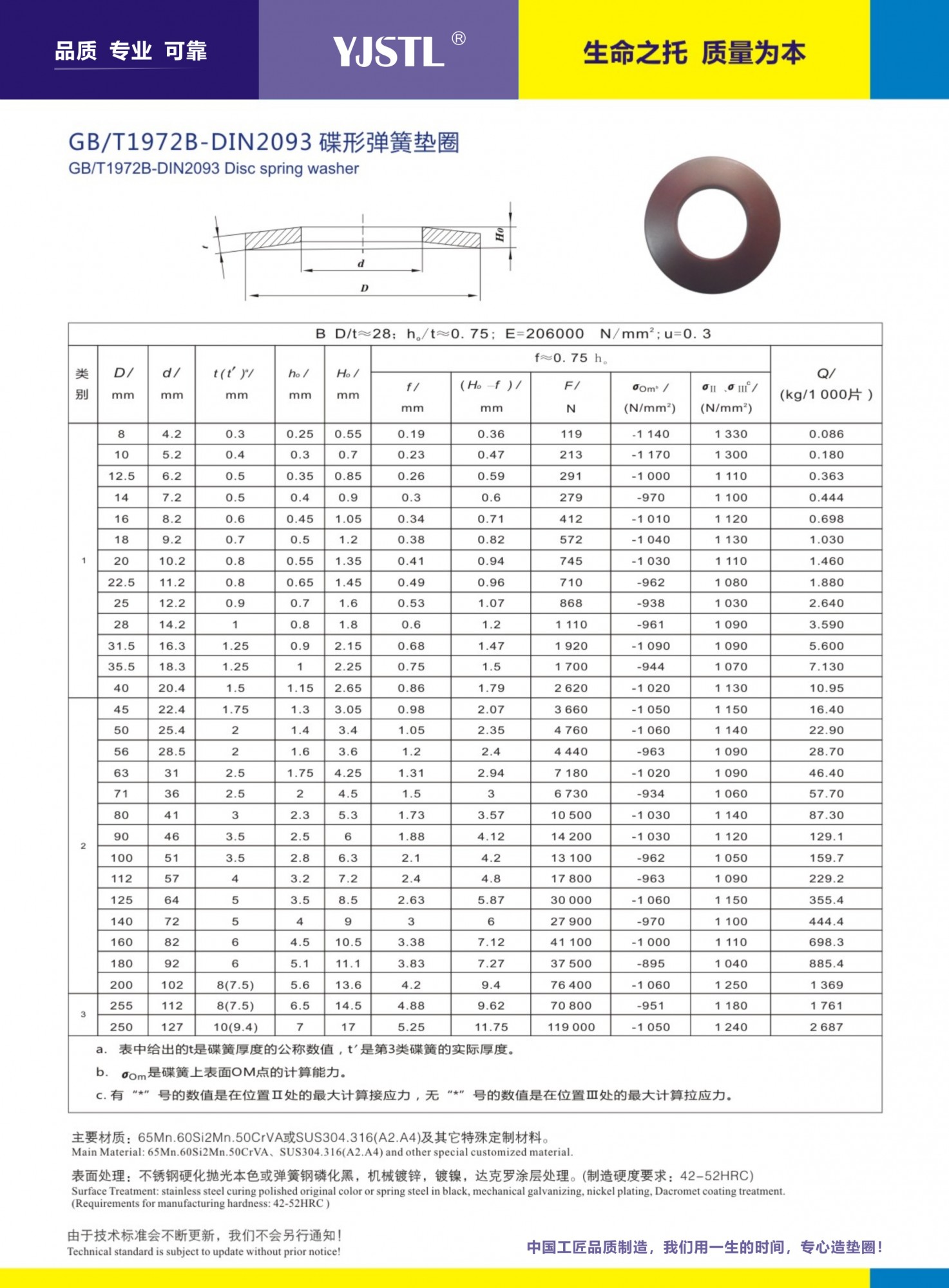 制造執(zhí)行標(biāo)準(zhǔn):國標(biāo)GB1972ABC引用DIN2093(ABC系)。規(guī)格:M-M127 也能根據(jù)客戶需求提供訂制,主要材質(zhì)有65MN,60Si2mn,51crav4及特殊合金材質(zhì),鹽浴硬化,表面處理為磷化黑,機(jī)械鋅,達(dá)克羅涂層等!不提供化學(xué)電鍍處理!多數(shù)情況下標(biāo)準(zhǔn)型碟形彈簧墊圈并不能完全滿足用戶要求,通過計算與適當(dāng)調(diào)整來獲得理想的訂制功能!