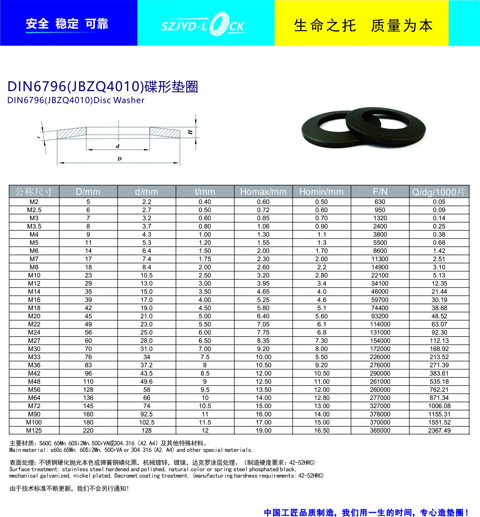 制造執行標準:符合JBZQ4010機械標準。規格:M2-M125型號,也可提供訂制服務主要材質有S60C,60Si2mn,51crav4及特殊合金材質,鹽浴硬化,表面處理為磷化黑,機械鋅,達克羅涂層等!不提供化學電鍍處理!多數情況下標準型碟形彈簧墊圈并不能完全滿足用戶要求,通過計算與適當調整來獲得理想的訂制功能!