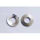 DIN6795是德國標準、該墊圈是一款法式鎖緊墊圈的改良設計產品、表面條紋有預緊防松作用。墊圈的背面設計有六個爪形剌破角!主要功能是在配合螺栓螺釘擰緊時可以剌破金屬基體表面!主要功能是剌破作用、因此也有人叫剌破墊圈、帶爪觸地墊圈!