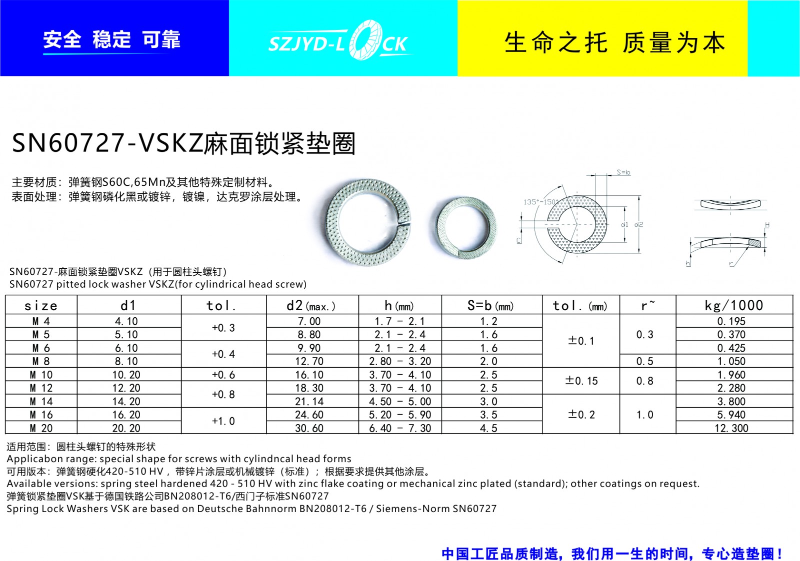 SN60727-VSKZ 麻面墊圈由西門子軌道交通公司設(shè)計制定、基于張力摩擦的構(gòu)造原理。鞍形墊圈表面麻面花紋與螺栓鎖緊面接觸,增大的鎖緊力起到了明顯防松功能!VSKZ標(biāo)準(zhǔn)窄型麻面墊圈適用于較小安裝空間!