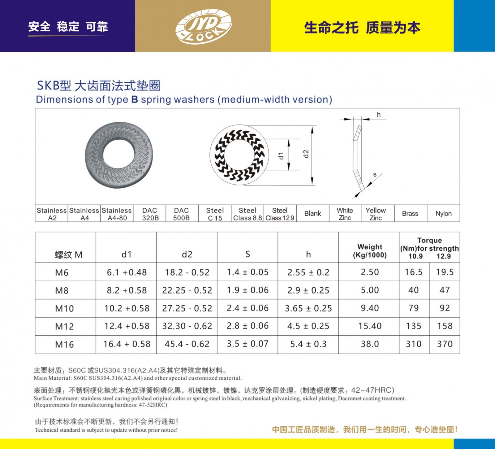 SKB墊圈制造:SKB鎖緊墊圈執行標準 規格:M6-m12型號。還可按要求提供訂制。 主要鋼質:SUS304.316、A2.A4及超級不銹鋼等 硬化等級:HV350 符合10級強度 表面處理:硬化拋光清洗 經有效測試800小時以上 完全符合歐盟ROHS標準、