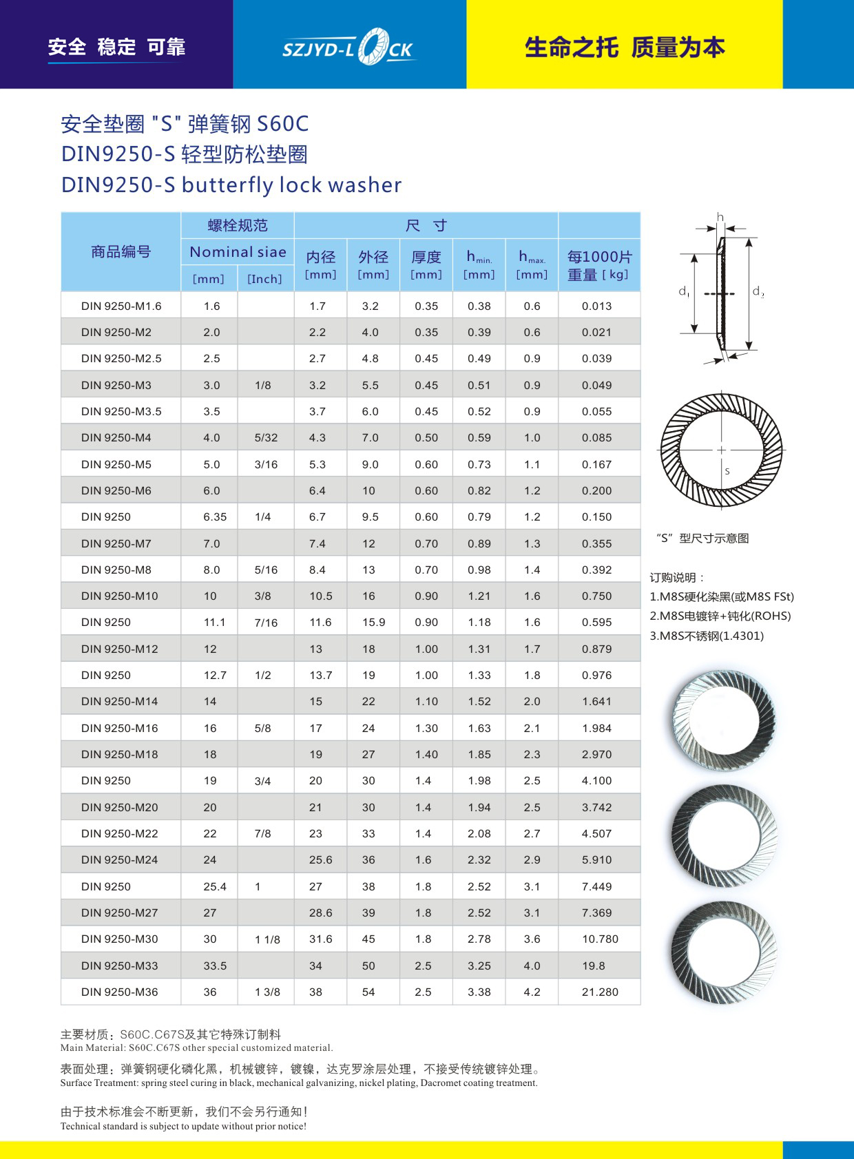 DIN9250防松墊圈、執行德國標準、按螺栓的使用條件分為兩類:8.8級以下螺栓均選用S輕型安全防松墊圈、10.9級以上螺栓均先用VS重型安全墊圈系列、