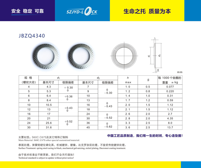 JBZQ4340防松墊圈、執行中國機械標準、通常配合8.8級以上螺栓使用!技術成熟、性能穩定、性價比高正在被越來越多的工業裝備領域大量使用!