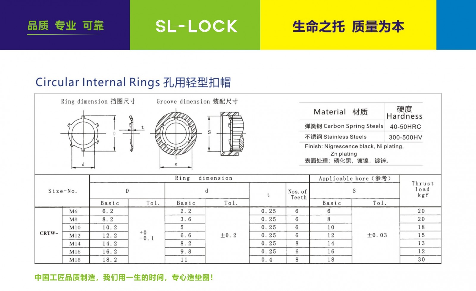 名稱:輕型孔用止動墊圈 執行標準:CRTW 型號:M6-M18 材質:65MN/C67S 表面處理:磷化黑色