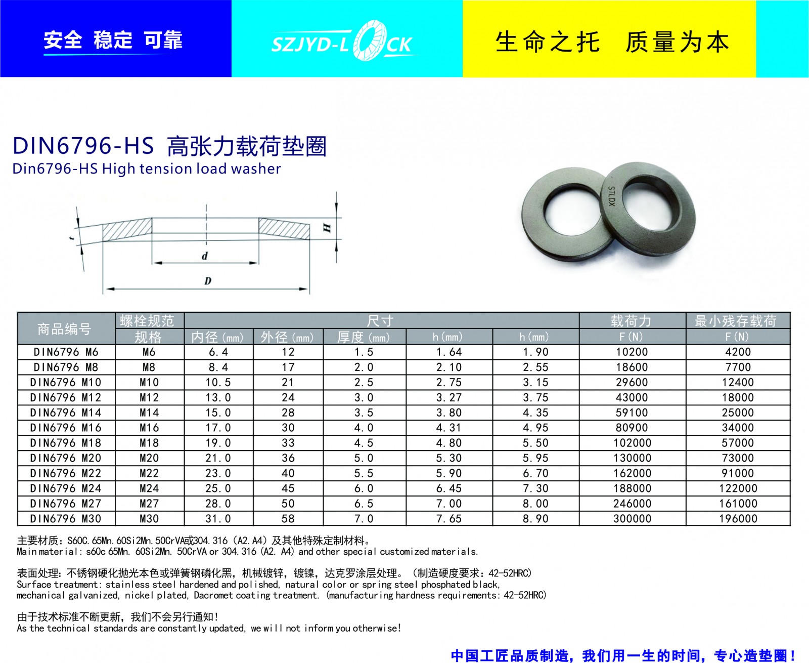 制造執行標準:符合DIN6796-HS標準。規格:M6-M30型號,也可提供訂制服務主要材質有S60C,60Si2mn,51crav4及SUS304\SUS316特殊合金等,經等溫精細硬后進行磷化黑,機械鋅,鋅鋁涂層表面處理等!安全墊圈不適宜化學表面處理!多數標準型碟形彈簧墊圈有時并不能完全滿足設計要求,通過計算與調整訂制來獲得理想安全功能!