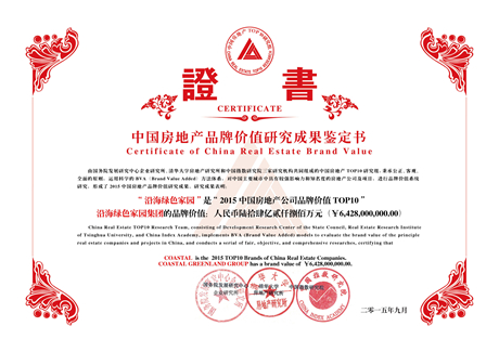 沿海綠色家園連續十二年榮登“中國房地產品牌價值TOP10”榜單