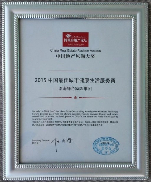 沿海綠色家園集團榮膺2015中國最佳城市健康生活服務商